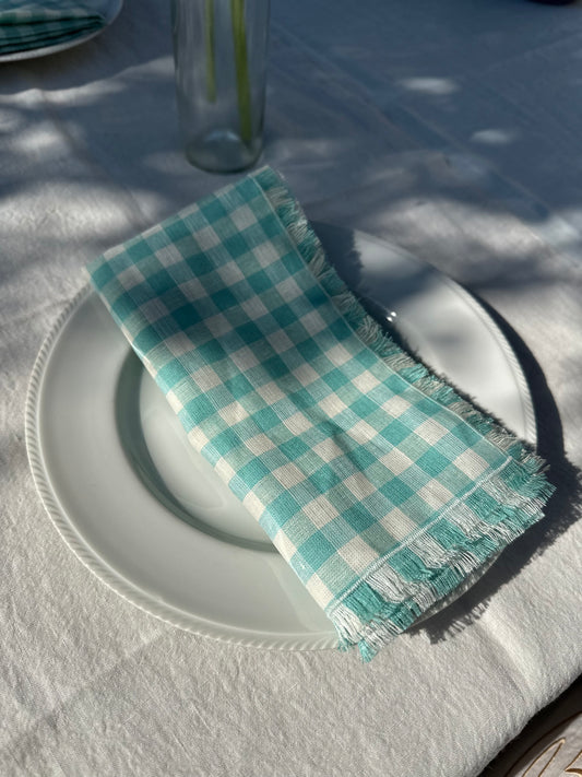 Blue and White Linen Napkin, Vichy with Fringe