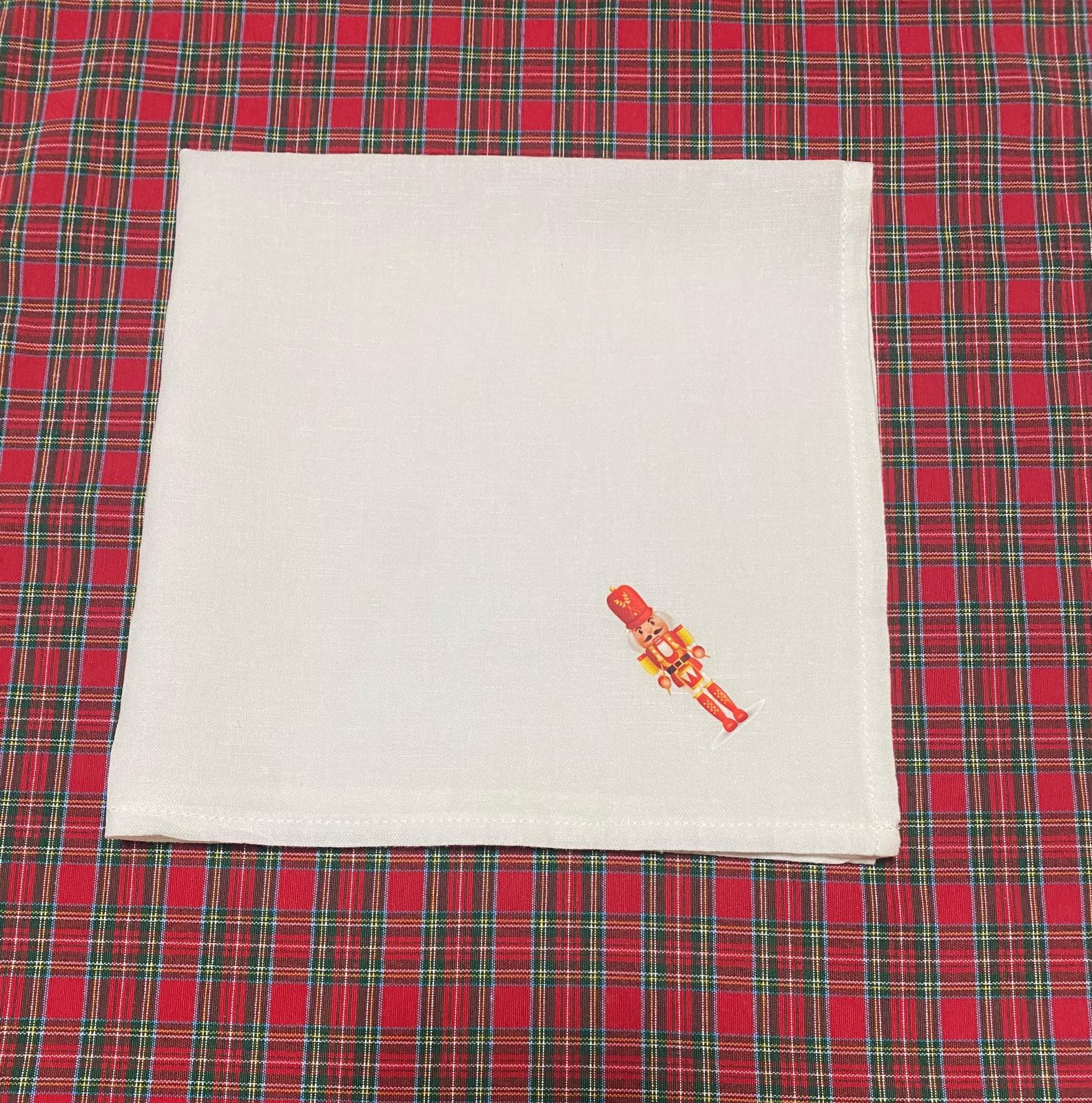 White linen napkin featuring charming Christmas motifs, including a Snowman and a Nutcracker. This practical and delightful piece brings joy and a relaxed touch to your festive table setting. Perfect for adding a playful yet elegant detail to Christmas meals and gatherings.
